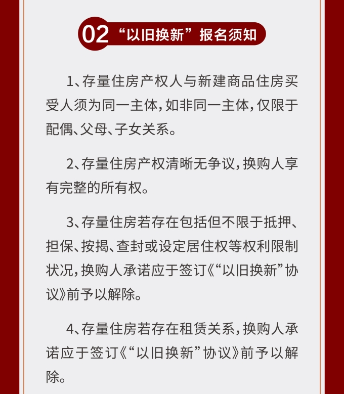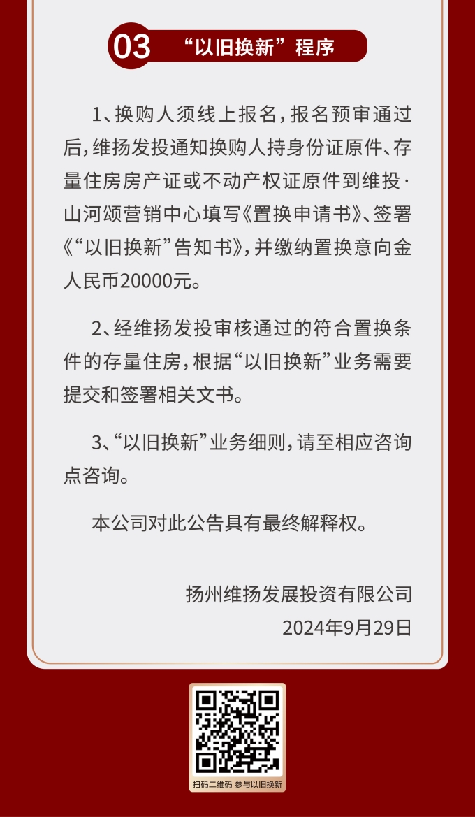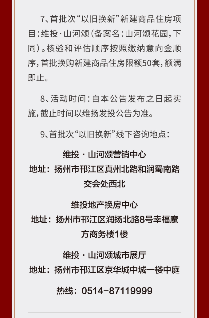 維揚(yáng)地產(chǎn)積極響應(yīng)政府新推行的“以舊換新”政策,踐行“惠民”理念,打造高品質(zhì)住宅,滿足揚(yáng)州人民改善型住房需求。此次維揚(yáng)發(fā)投“以舊換新”工作以其自主開發(fā)的維投·山河頌項(xiàng)目為試點(diǎn),由國(guó)企背書、置換范圍廣、全流程專業(yè)服務(wù)。首批換購(gòu)新建商品住房限額50套,換購(gòu)人可通過登錄“維揚(yáng)發(fā)投商品住房‘以舊換新’線上報(bào)名系統(tǒng)”報(bào)名,具體要求詳見公告。